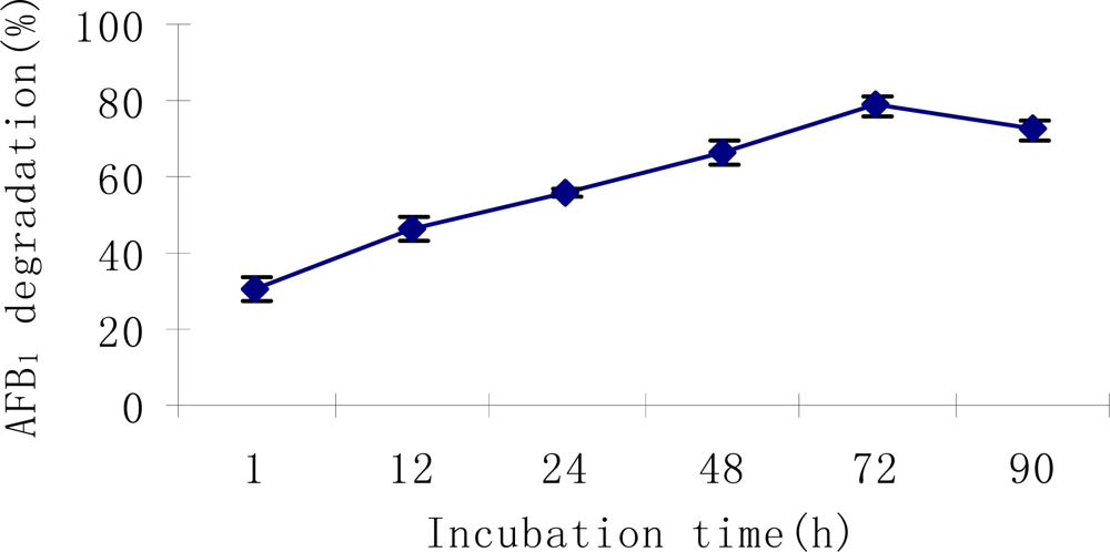 Isolate 35-3 grown in NB for 24 h was centrifuged with 10,000 g at 4 °C for 20 min, and the resulting culture supernatant was tested for AFB1 degradation. AFB1 methanol stock solution (0.2 mL) was added to 0.8 mL culture supernatant in a 7 mL tube. The reaction mixture was incubated in the dark at 37 °C without shaking for 1, 12, 24, 48, 72 and 90 h, respectively. To determine the effect of temperature, the mixtures were incubated at 20, 30 and 37 °C, respectively for 72 h. Controls were set at the above temperatures by using NB medium.