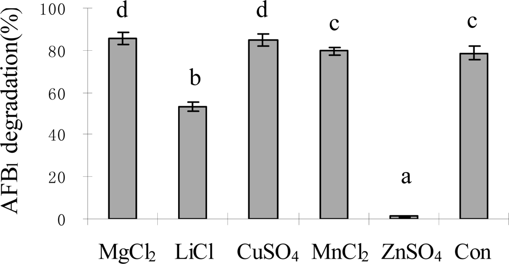 Effects of ions on AFB1 degradation by culture supernatant of S. maltophilia 35-3. Nutrient broth (NB) was used to substitute culture supernatant as a control. The values are means of three replicates and their standard errors. Means with different letters are significantly different according to Duncan’s Multiple Range Test (P <0.05).