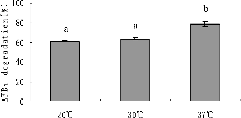 Effect of temperature on AFB1 degradation by culture supernatant of S. maltophilia 35-3. The values are means of three replicates and their standard errors. Means with different letters are significantly different according to Duncan’s Multiple Range Test (P <0.05).