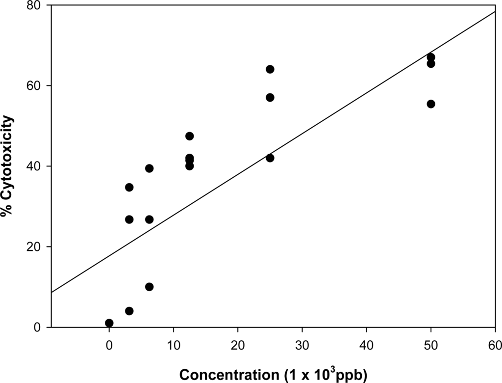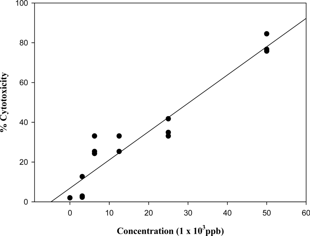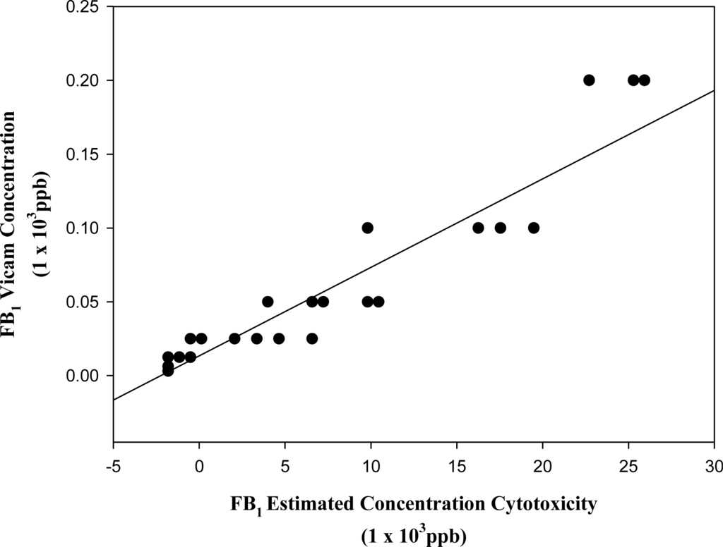 Dose- response linear regression curve of fumonisin B1 standard on the human lymphocyte cell line (r = 0.958). All plotted dots of the curves represent means of 3 measurements in 3 distinct test procedures.