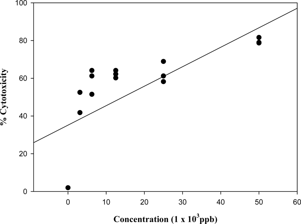 Deoxynivalenol and FB1 were found to be less cytotoxic (p<0.05) than OTA (Figure. 3, IC50 = 20 ppb (20 ppb OTA) after 24 hrs of incubation. The regression coefficient of OTA toxicity to the lymphocytes was found to be 820 ppb. Once again, a similar trend was also observed, as there was no significant difference in cell viability at low concentrations less than 25 ppb OTA on the lymphocytes. Contrary to the effects of DON and FB1, no dose dependant reduction in cell viability (≤ 17 %) was observed at a higher concentration of 50 ppb OTA with respect to 25 ppb OTA treatment.