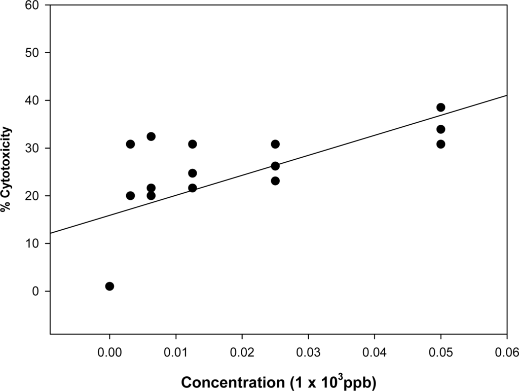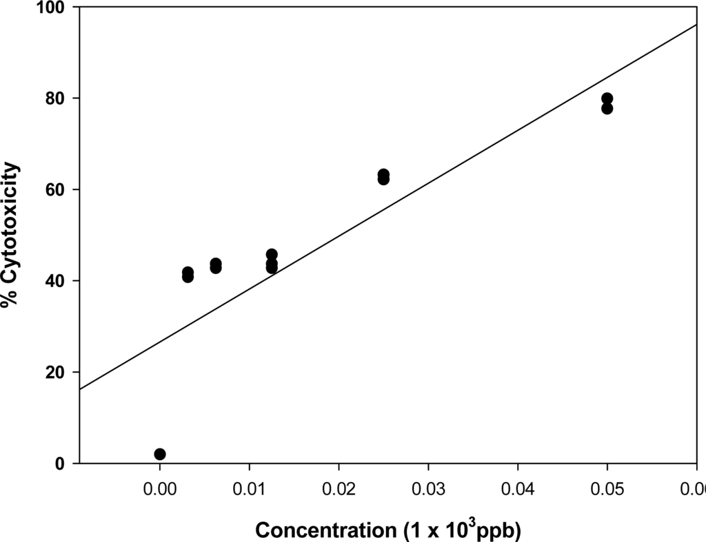 Dose- response linear regression curve of ochratoxin A standard on the human lymphocyte cell line (r = 0.819). All plotted dots of the curves represent means of 3 measurements in 3 distinct test procedures.
