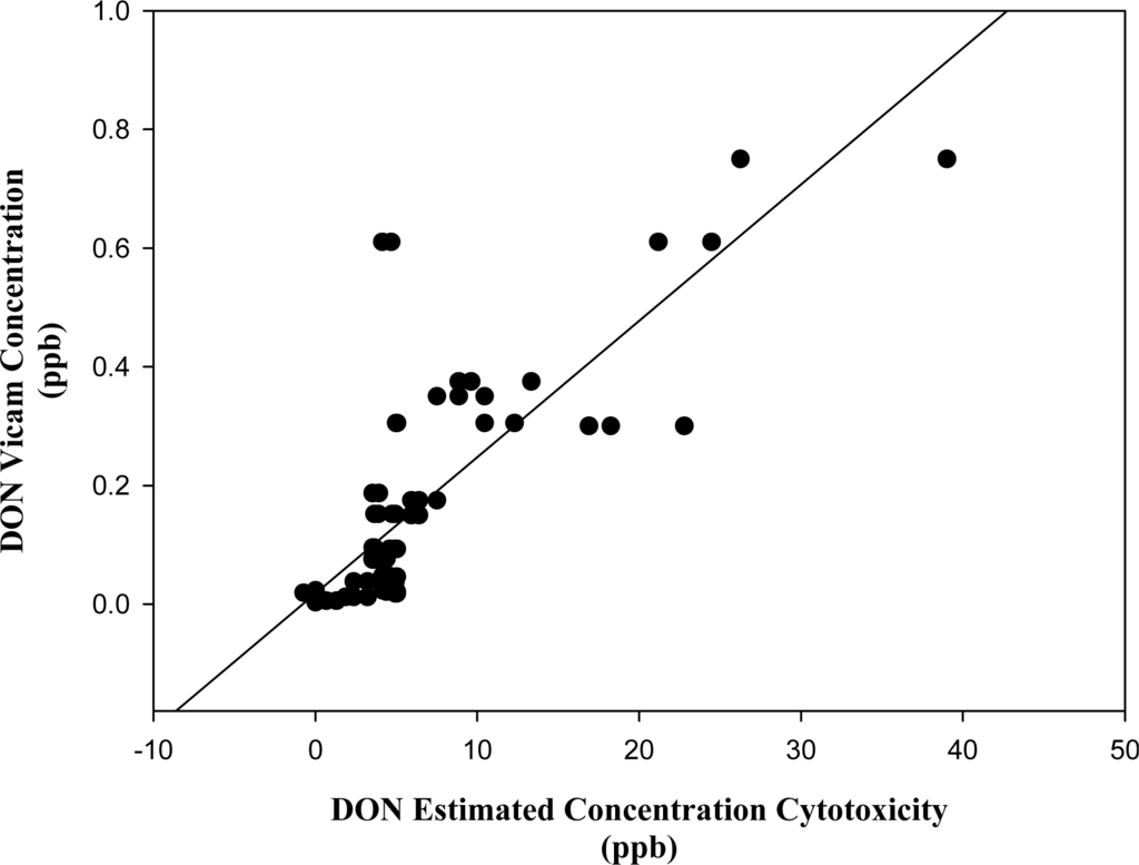 Linear regression curve of deoxynivalenol, actual and estimated concentration values (r = 0.802).