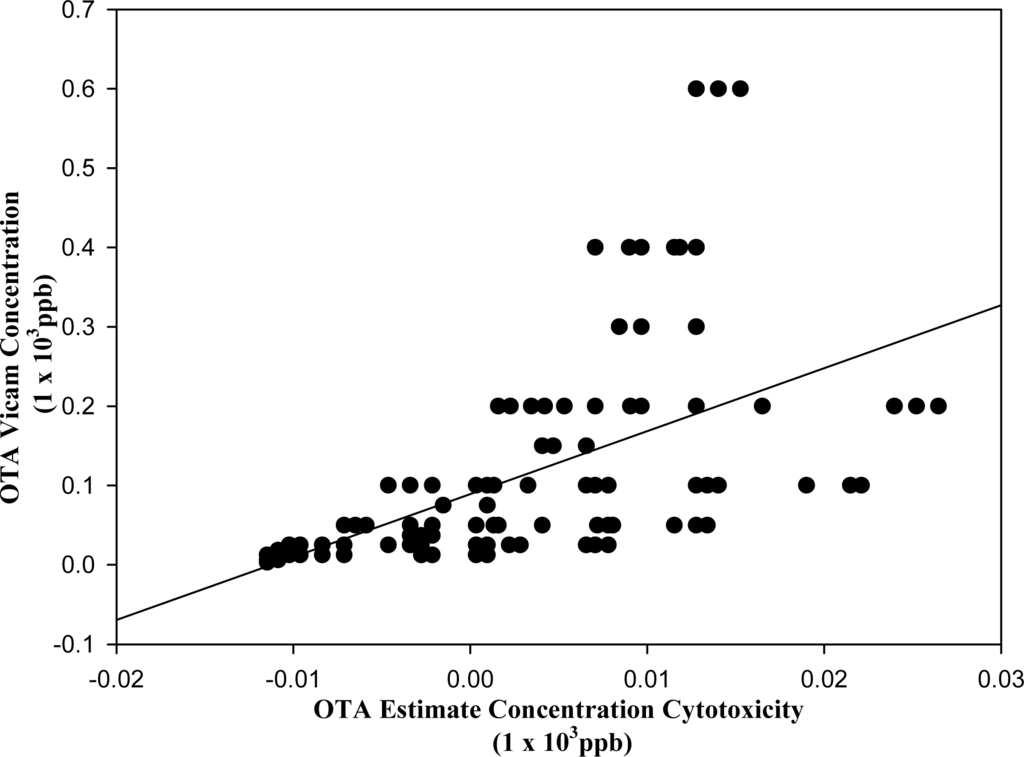 As opposed to the correlation between analysis and cytotoxic response found for DON and FB1, none was found in the case of OTA positive barley extracts (A) (r = 0.371) (Figure 6C). The actual and estimated linear regression curve of OTA indicates two sets of data, one having high concentrations of OTA, as determine by analysis but resulting in low cytotoxicity and the other data indicating high cytotoxicity of extracts with low analytical concentrations.