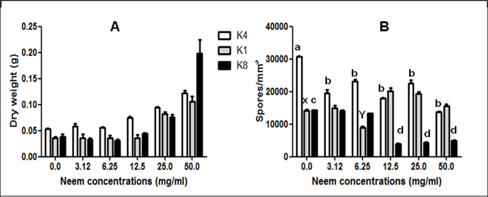 Effect of NLE added on PD medium on dry weight (A) and on spore numbers (B) of P citrinum (isolates K1, K4 and K8). Bars indicate standard deviation for experiments carried out in four replicates. Different small letters over the columns indicate statistically significant differences (p<0.05) for K4 spore numbers (a, b), K1 spore numbers (x, y) and K8 spore numbers (c, d).