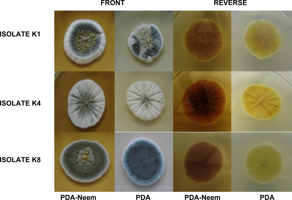 Direct contact of fungus with NLE on PDA surface resulted in differences between macroscopic colonies features but not at microscopic ones. Colonies grown on PDA-neem (Figure 2) were not only bigger in size than control colonies but their appearance differed too: colonies were radially sulcate, moderately deep and produced exudates.