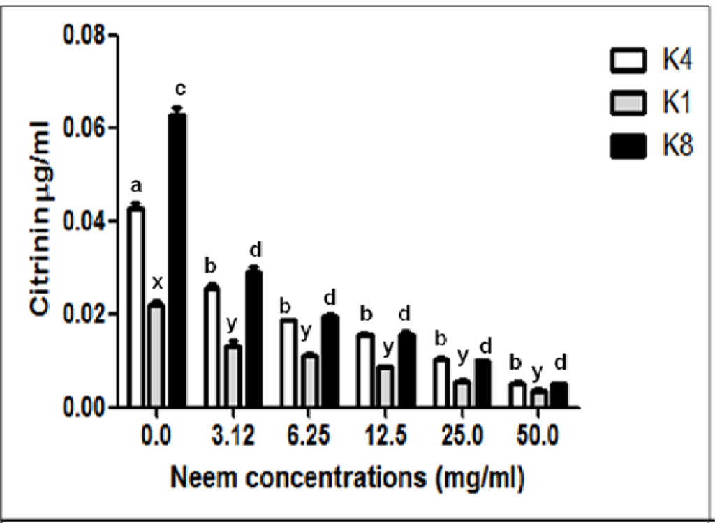 Neem extracts reached 87.16% inhibition on K4 citrinin production at NLE 3.12 mg/mL, 85.86% inhibition on K1 citrinin production at NLE 3.12 mg/mL, and 94.86% inhibition on K8 citrinin production at NLE 6.25 mg/mL (Table 1). HPLC results confirmed spectrophotometer and TLC experiments and showed higher sensitivity. Generally, toxin production decreases as mycelium formation decreases. However citrinin inhibition was more significant than mycelial alteration.