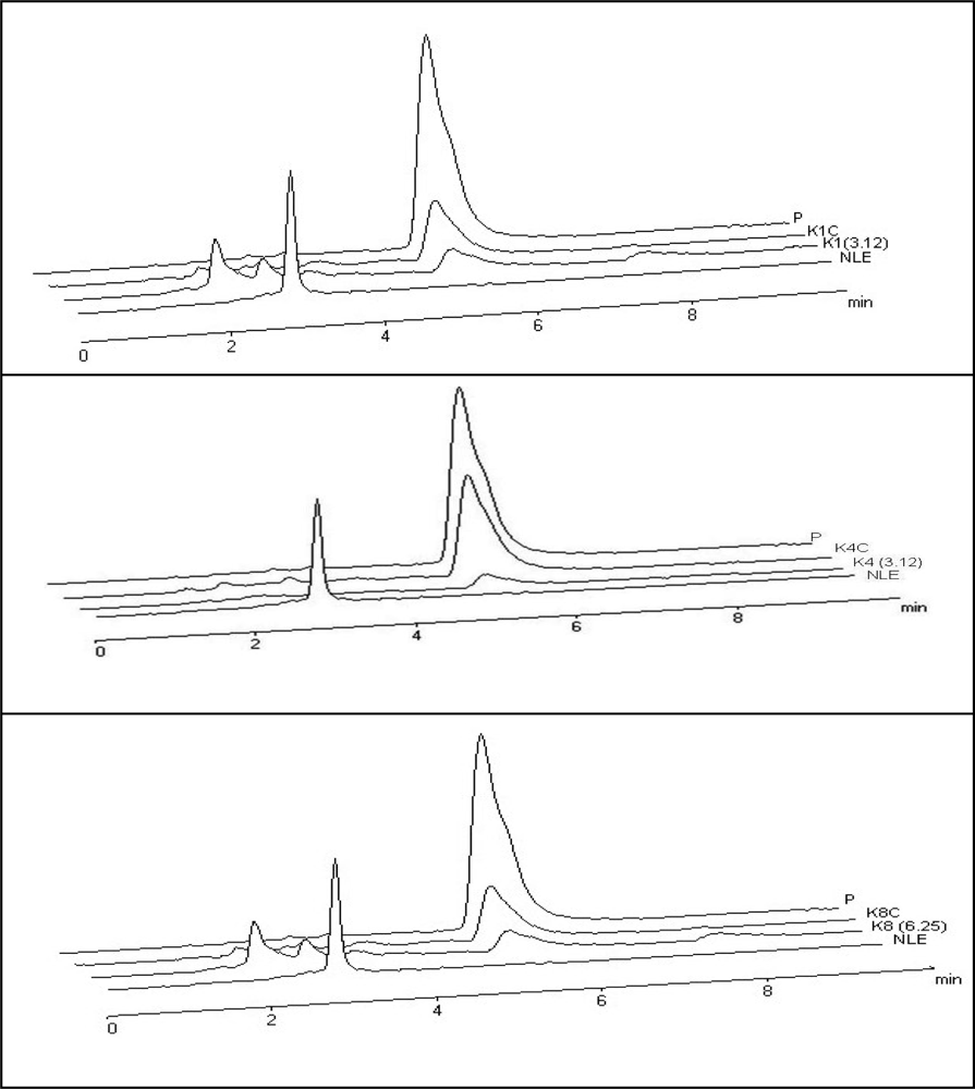 Figure 3 shows the effects of NLE on citrinin production by P. citrinum isolates in PD broth, determinated by spectrophotometric experiments. After 21 days, quantitative determination [] of the extracts from liquid culture media demonstrated inhibition of citrinin production by three isolates of P. citrinum on media with NLE. Inhibition of citrinin production does not appear to be simply a function of mycelia mass. The quantification of citrinin was also done by HPLC by comparing the retention times of the culture extracts with that of an authentic sample of citrinin. Standard and citrinin from samples were eluted between 5 to 6 min., as seen in Figure 4. The small peaks at 2–3 min. retention times (K1, 3.12 and K8, 6.25 mg/mL) were not identified and may be co-production metabolites of fungal growth.