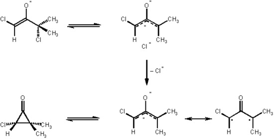 5. For gas chromatography, the we used a 2.3 m glass column, packed with 5% OV 101 on Gaschrom Q, using a temperature program from 80 to 220°C, 8 K/min, with FID detector; the carrier gas was nitrogen. Retention times: tR = 0.63 min (3-chloro-3-methylbutan-2-one), tR = 2.36 min (1,3-dichloro-3-methylbutan-2-one), tR = 3.31 min (1,1,3-trichloro-3-methylbutan-2-one).