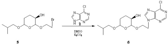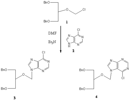 In principle, coupling condensation of the halo ethers with 6-chloropurine give the corresponding nucleosides as a mixture of N-7 and N-9 alkylated products. For example, 6- chloropurine 2 reacts with compound 4 in DMF to produce the 9-alkylated product 5 and N-7 isomer 6. Heating the mixture of products results in the complete conversion of 7-alkylated isomer into 9-alkylated one (Scheme1) [12].