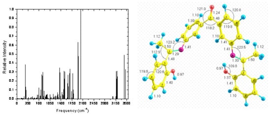 All calculations in this work where carried out with the AM1 level of theory using the GAUSSIAN 03 [] suite of programs. In addition we have carried very intense B3LYP/6-31G* optimizations and frequency calculations. More information about these methods is available elsewhere []. Figure 1 presents the optimized structure of the molecule with bond lengths and bond angles shown as well as the theoretical IR vibrational spectrum.