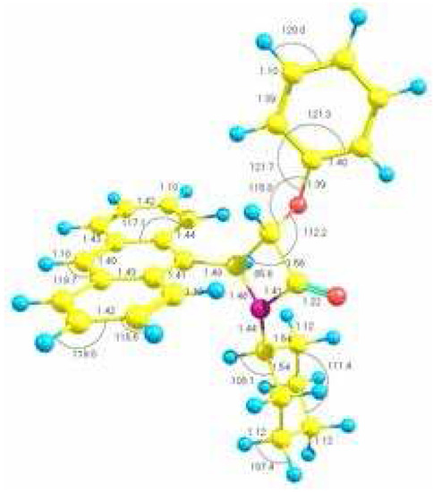 The presence of this new compound was confirmed by t.l.c. monitoring. Its IR spectrum showed the β-lactam carbonyl at 1778.0 cm−1. The indicated trans stereochemistry for this polycyclic β-lactam was deduced from analysis of its 1H-NMR spectrum. The coupling constant of H-3 and H-4 is 1.55 Hz which is consistent with this kind of stereochemistry. In addition, 13C-NMR spectroscopic data of β-lactam 2 definitely showed the β-lactam carbonyl at 167.23. The mass spectrum showed the M and M+1 at 421 and 422 respectively. We next performed theoretical calculations to present a viable structure for the product. All calculations in this work were carried out with the AM1 level of theory using the GAUSSIAN03 suite of programs [8]. More information about these methods is available elsewhere [9]. Figure 1 presents the optimized structure of the molecule with bond lengths and bond angles shown.