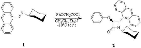 Polyaromatic aldimine 1 was prepared in quantitative yield by condensation of cyclohexylamin and 9-anthraldehyd in refluxing ethanol. The formation of Schiff base 1 was readily established from its spectral data. Treatment of 1 with the ketene derived from phenoxyacetyl chloride in the presence of triethylamine afforded trans-2-azetidinone 2 (Scheme 1).