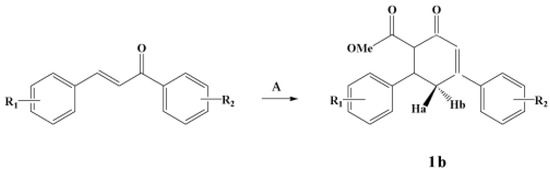 Chemical synthesis of methyl 1-oxo-3,5-diphenylcyclohexene-6-carboxylate 1b (R1= R2: H). A represents CH3COCH2CO2CH3, NaOMe, MeOH, rt.