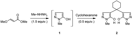 During our ongoing research on pyrano[2,3-c]pyrazol-4(1H)-ones [1,2,3,4,5] we were interested in the not yet commercially available methylpyrazolone 1. Although dozens of patents and journal articles deal with its synthesis, most of them include multi-step reactions or seem to be less suited for laboratory scale preparations. Thus, we chose to follow a patent protocol, which starts from alkoxyacrylic alkyl esters and alkylhydrazines [6]. Recently, we have successfully applied that procedure to yield the unsubstituted pyrazolone [7]. Unfortunately, no work up for the crude methylpyrazolone 1 is published in the original patent (only GC/MS analysis is carried out). When we tried to find a proper solvent to precipitate the desired methylpyrazolone from the oily reaction syrup, we found that ketones – such as acetone or cyclohexanone – readily react and give colourless precipitates as the analysis of such a precipitate revealed. A representative procedure with cyclohexanone is presented in the experimental part [Scheme 1].