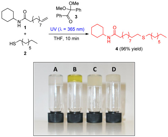 Herein, we report the practical preparation of the low-molecular-weight gelator N-cyclohexyl-11-(octylthio)undecanamide (4) by thiol-ene click coupling reaction under UV light irradiation (Figure 1 left). Alkene precursor 1 was easily prepared by DCC-coupling between cylohexylamine and the corresponding acid derivative in CH2Cl2. The title compound 4 was characterized by elemental analysis, FT-IR, 1H NMR, 13C NMR and MS spectroscopic methods (see Experimental Section). Interestingly, 4 was found to act as an efficient gelator for fluid oils (Figure 1 right, vials A−C) through molecular self-assembly driven by non-covalent interactions. The minimum gelation concentrations (MGC) were found to be lower than 1 wt.%, and the gel-to-sol transition temperatures (Tgel) in the range of 27−39 °C. As expected, Tgel values were found to increase with the concentration of the gelator probably due to the formation of more closely packed 3D-networks [7]. All gels were stable for several weeks below their Tgel, and showed a thermoreversible response that was reproducible over several heating/cooling cycles. A novel ionogel made of 4 in ionic liquid C10MIMCl was also successfully prepared (Figure 1 right, vial D).
