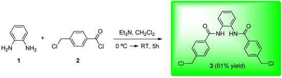 We report here the synthesis of N,N'-1,2-phenylenebis[4-(chloromethyl)benzamide] (3) by nucleophilic acyl substitution of 4-(chloromethyl)benzoyl chloride (2) with 1,2-phenylenediamine (1) in the presence of Et3N (Scheme 1) [7].