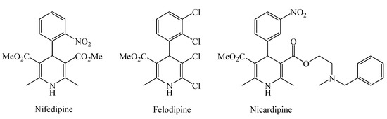 1,4-Dihydropyridines (DHPs) have attracted immense attention for synthetic and medicinal chemists due to their biological and pharmacological properties [1]. 1,4-DHPs, as a class of calcium modulators, are extensively investigated because of their pharmacological activity as drugs in vasodilatation, hepatoprotection, neuromodulatory, cognition, memory enhancing, neuroprotection, anti-atherosclerosis, anti-diabetes, antioxidant, anti-mutagenic, and anti-tumor [2]. The most notable examples are the 1,4-DHP based calcium channel blocker drugs such as nifedipine, felodipine, and nicardipine (Figure 1), which are widely used for the treatment of hypertension and related cardiovascular diseases [3,4].