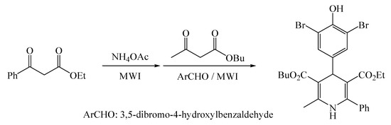 One-pot two-step Hantzsch synthesis of 4-(3,5-dibromo-4-hydroxyphenyl)-3- butoxycarbonyl-5-ethoxycarbonyl-2-methyl-6-phenyl-1,4-dihydropyridine under solvent- and catalyst-free conditions promoted with microwave irradiation is presented.