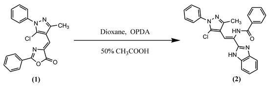 Synthesis of N-[1-(1H-benzimidazol-2-yl)-2-(5-chloro-3-methyl-1-phenyl-1H-pyrazol-4-yl)vinyl]benzamide (2)