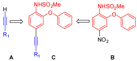 The disubstituted alkynes have long been of interest because of their numerous applications and uses in synthetic organic chemistry, molecular electronics and pharmacology. They mainly exhibit anti bacterial and anti cancer activities [1]. On the other hand, compounds containing sulfonamide moiety e.g., 4-[5-(4-chlorophenyl)-3-(trifluoromethyl)-1H-pyrazol-1-yl]benzenesulfonamide (SC236) showed enhanced cytotoxic effects of doxorubicin on HKESC-1 and HKESC-2 cells [2]. Nimesulide B (Figure 1), a sulfonamide based well known antiinflamatory agent, is presently in patient’s use in certain countries. Because of their common cytotoxic properties and our interest in nimesulide (N-(4-nitro-2-phenoxy phenyl)methane sulfonamide) derivatives [3,4,5,6,7,8,9,10] as potential cytotoxic agents, we designed the appropriately functionalized hybrid molecule C containing structural features of both A and B (Figure 1).