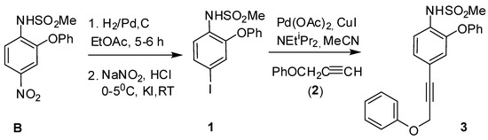 The starting compound 1 required for our study was prepared in quantitative yield from nimesulide (B) via reduction of its nitro group to primary amine followed by conversion of the amine moiety to an iodo goup under a Sandmeyer reaction condition. The Sonogashira cross-coupling was then employed to form a carbon–carbon bond between the aryl iodide (1) and the terminal alkyne (2). The reaction was carried out under mild conditions.