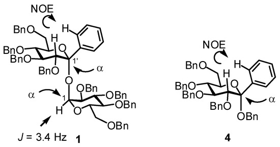The configuration of the two glycosidic linkages of 1 was determined by NOE and 1H-NMR experiments. The NOE interaction between aromatic-ortho H and H-2' as shown in Figure 1 was observed. This observation inevitably indicated the equatorial orientation of the phenyl group and determined the α-ketopyranosidic linkage. The α-aldopyranosidic linkage was confirmed by the coupling constant (J = 3.4 Hz) of H-1. Thus, both the glycosidic linkages of 1 were α. The ketopyranosidic linkage of 4 was similarly determined as an α by the NOE interaction.