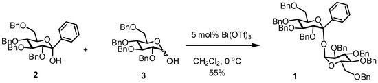 We designed a novel non-reducing disaccharide using the 1-C-phenyl-d-glucopyranose derivative as a trehalose analog. This paper describes the synthesis of 2,3,4,6-tetra-O-benzyl-1-C-phenyl-d-glucopyranosyl 2,3,4,6-tetra-O-benzyl-d-glucopyranoside (1) by the Bi(OTf)3-catalyzed ketosylation of 2,3,4,6-tetra-O-benzyl-1-C-phenyl-d-glucopyranose (2) [8,9] into 2,3,4,6-tetra-O-benzyl-d-glucopyranose (3) [10].
