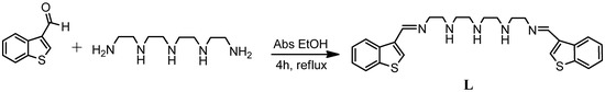 A novel probe L has been synthesized by classical Schiff-base reaction between 1-benzothiophene-3-carbaldehyde and tetraethylenepentamine as diamine. The structure of compound L was confirmed by melting point, elemental analysis, ESI-MS spectrometry, IR and 13C-NMR and 1H-NMR spectroscopy.