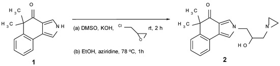 Chlorambucil and melphalan are chemotherapy drugs belonging to the class of nitrogen mustard alkylating agents. Both compounds are believed to exert their antitumor effects by cross-linking DNA via aziridinium cation intermediates arising from the bis(2-chloroethyl)amine moiety [1]. Besides that there are anticancer agents with the aziridine moiety, such as TEPA, thio-TEPA and triethylenemelamine with a 1,3,5-triazine nucleus. In continuation of our department’s previous studies in the field of antitumor agents [2,3,4,5,6,7,8,9,10], we are reporting in this paper the synthesis of the oxonaphthalene-annelated pyrrole 2 with an attached side chain containing an aziridine group. The rationale is that the three-membered aziridine ring is struturally analogous to the immonium-intermediate formed from the nitrogen mustards. The aziridine moietiy is not charged and the reactivity results from the strain on the three-member ring structure [11]. Recent studies with aziridine substituted quinones showed promising results against breast cancer tumor cells [12,13]. The cytotoxic activity of 2 was evaluated.