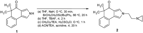 Reaction of 1 [17] with t-BuPh2Si-protected hydroxyethyl bromide [18] with NaH in THF afforded the N-alkylated product. The following deprotection with tetrabutylammonium fluoride [19] furnished the alcohol which was treated with methansulfonic chloride [20]. The resulting mesylate was converted via reaction with aziridine into the target compound 2 (Scheme 1). The biological activity of 2 was tested against two cancer cell lines, KB-31 and KB-8511, respectively. KB-31 is a drug-sensitive human epidermoid cell line, whereas KB-8511 is a multi-drug resistant subline, typically overexpressing P-glycoprotein. The IC50[μM] values of 2 are >10.000 (KB-31) and 8.680 (KB-8511), respectively (3 days incubation time; staining with 0.05% methylene blue; optical density measured at 665 nm; for further experimental details, see [21,22]).