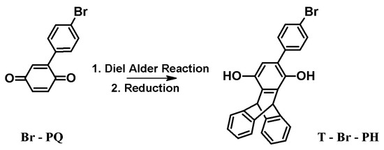 4-Bromophenylquinone (Br-PQ) was synthesized by the reaction among 4-bromo aniline and benzoquinone [1]. The triptycene ring creation was achieved by the Diels Alder reaction [2,3,4]. In the course of our work on the synthesis, first we planned and synthesized Br-PQ in the typical method already reported; and finally the target molecule (Scheme 1).