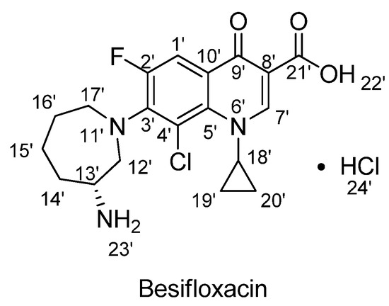 Besifloxacin, (+)-7-[(3R)-3-aminohexahydro-1H-azepin-1-yl]-8-chloro-1-cyclopropyl-6-fluoro-4-oxo-1,4-dihydroquinoline-3-carboxylic acid hydrochloride, developed by SS Pharmaceutical (SSP) Co. Ltd. (Figure 1), was a fourth-generation fluoroquinolone antibiotic [1,2,3,4,5]. Besifloxacin hydrochloride eye drop was used to treat bacterial conjunctivitis caused by aerobic and facultative Gram-positive microorganisms and aerobic and facultative Gram-negative microorganisms.
