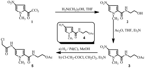 Scheme 1. Synthesis of 2-(4-(2-chloroacetamido)-1-methyl-1H-pyrrole-2-carboxamido)ethyl acetate (5).