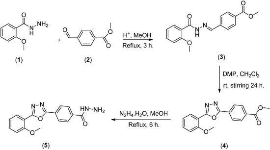 4-(5-(2-Methoxyphenyl)-1,3,4-oxadiazol-2-yl)benzohydrazide (5) was synthesized by three steps. The synthesis started with 2-methoxybenzohydrazide to form hydrazone (3) which was then cyclized to oxadiazole (4) and finally, treatment of oxadiazole (4) with hydrazine hydrate afforded the final product (5).