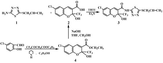 The synthesis of 6-chloro-2-hydroxy-2-trifluoromethyl-2H-chromene-3-carboxylic acid (5-allylsulfanyl-[1,3,4]thiadiazol-2-yl)-amide, 3.