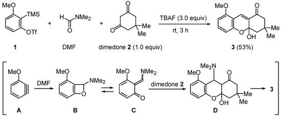 First, the 2H-chromene derivative 3 was prepared according to our reported method (Scheme 1) [17]. To suppress the competitive reaction of aryne A with dimedone (2), N,N-dimethylformamide (DMF) was employed as a solvent. In the presence of anhydrous TBAF (3 equiv.), treatment of triflate 1 with dimedone (2) in DMF at room temperature for 3 h gave the desired 2H-chromene 3 in 53% yield. This transformation proceeds via the insertion of aryne A, generated from ortho-(trimethylsilyl)aryl triflate 1, into the C=O of DMF and the nucleophilic addition of dimedone (2) to benzoxetene B or ortho-quinone methide C.