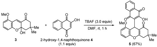For the synthesis of the title compound 5, 2-hydroxy-1,4-naphthoquinone (4) was employed as a nucleophile (Scheme 2). In the presence of anhydrous TBAF (3 equiv.), we allowed 2H-chromene 3 to react with 1.1 equiv. of 2-hydroxy-1,4-naphthoquinone 4 in DMF. As expected, the title compound 5 was obtained in 67% yield. We were gratified to observe that 2-hydroxy-1,4-naphthoquinone 4 acts as a nucleophilic active methylene compound with the sufficient reactivity toward 2H-chromene 3.