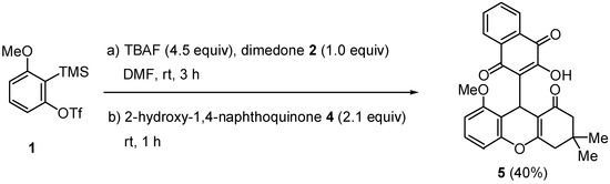 As an alternative convenient approach to title compound 5, we next directed our attention to the direct one-pot synthesis of 5 from aryne precursor 1 (Scheme 3). The two-step preparation was successfully applied in the convenient one-pot synthesis. At first, triflate 1 in DMF was treated with dimedone (2) in the presence of anhydrous TBAF. After being stirred for 3 h, 2-hydroxy-1,4-naphthoquinone (4, 2.1 equiv.) was added to the reaction mixture. After the purification, the desired title compound 5 was isolated in 40% yield.