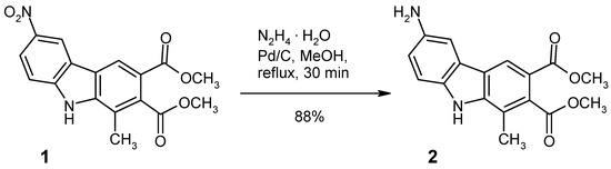 1-Methylcarbazole constitutes an essential fragment of the antitumor alkaloid, olivacine (1,5-dimethylpyrido[3,4-b]carbazole) [1] and drug candidates derived thereof, like S16020-2 [2]. Such compounds are known to act as topoisomerase II poisons and as another common structural feature they possess a heteroaromatic ring fused to the carbazole 2,3-bond. Typically, this is a pyridine unit (like in olivacine and its isomer, ellipticine [3]), but there are also examples for various diazine-fused 1-methyl- and 1,4-dimethylcarbazoles, exhibiting antitumor activity [4]. Among them, pyridazino[4,5-b]carbazoles (representing a 3-aza-olivacine scaffold) have been reported by us [5,6,7,8] and others [9]. As a key intermediate for the synthesis of these tetracycles, 1-methylcarbazole-2,3-dicarboxylic esters have been used and the latter were found to provide a convenient access also to some cytotoxic 4-methylpyrrolo[3,4-b]carbazole-1,3(2H,5H)-diones [10], which again feature the 1-methylcarbazole motif. In the course of extensive structural variation of the A-ring substitution pattern of such b-fused 1-methylcarbazoles, we recently reported the synthesis and cyclisation reactions of some halo- and nitro-substituted 1-methylcarbazole-2,3-dicarboxylic acid dimethyl esters [11]. As a further extension of our building-block library, we here describe the convenient preparation of dimethyl 6-amino-1-methyl-9H-carbazole-2,3-dicarboxylate (2) from the corresponding 6-nitro compound (1) [11] by a catalytic transfer hydrogenation protocol.