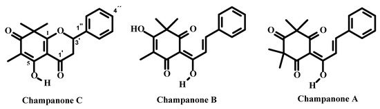 Champanone D, 6-(1,3-dihydroxy-3-phenylpropylidene)-5-hydroxy-2,2,4-trimethylcyclohex-4-ene-1,3-dione (2). Was isolated as amorphous yellow powder, m.p. = 139.5 °C–141.5 °C, FT-IR νKBrmax = 3045, 2989, 2930, 1734, 1645, 1630, 1440, 965. MS (TQD EI+): m/z 339.25 (25) [M+Na]+, 316.43 (70) [M+H]+, 284.54 (100).