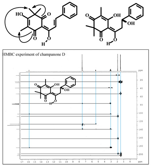 Nevertheless, the possibility that both compound have the same structure was excluded since 1H and 13C-NMR of champanone B were significantly dissimilar to those obtained in this work; in addition, HMBC experiment showed several anomalies. Thus, a carbonyl group at δ 198.11 ppm displayed long-range correlation with the methyl group and the gem-dimethyl group. However, the other carbonyl group at δ 201.79 only coupled to gem-dimethyl, which means coupling correlations involving five bonds (Figure 2, left). To meet all requirements of an HMB experiment, the new compound 2 should have several positions interchanged in relation to champanone B. If methyl and carbonyl groups were relocated as displayed in Figure 2 (right), all observed J3 and J2 long-range correlations would be correct.