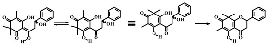 Champanone C, 5-hydroxy-6,8,8-trimethyl-2-phenyl-2H-chromene-4,7(3H,8H)-dione (1), was isolated as yellow needles, m.p. = 152.3 °C–153.2 °C. MS (TQD EI+): m/z 321.27 (40) [M+Na]+, 299.22 (70) [M+H]+, 227.29 (100).