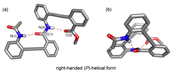 The three-dimensional structure of 3 was determined by X-ray crystallographic analysis [13,14]. Single crystals of 3 were obtained via the slow evaporation of tetrahydrofuran. The X-ray crystallographic structure of 3 was solved with a Cc spacer group, resulting in left- and right-handed folded structures containing 1.5 residues per turn (Figure 1). In the crystal structure of 3, two hydrogen bonds were observed between H-N(1) and C(1)=O(1) [N(1)···O(1) = 3.15 Å; N-H···O 165.9°] and between H-N(2) and C(2)=O(2) [N(2)···O(2) = 3.10 Å; N-H···O 159.9°]. The new folding molecule described in this study is expected to be useful for designing foldamer scaffolds.