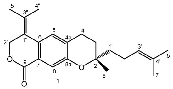(S)-2-Methyl-2-(4-methylpent-3-enyl)-6-(propan-2-ylidene)-3,4,6,7-tetrahydropyrano[4,3-g]chromen-9(2H)-one (1).