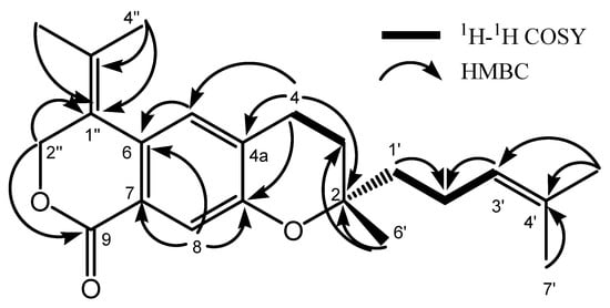 (S)-2-Methyl-2-(4-methylpent-3-enyl)-6-(propan-2-ylidene)-3,4,6,7-tetrahydropyrano[4,3-g]chromen-9(2H)-one (1) (Figure 1), was obtained as an orange amorphous powder, [α]20D +25.1° (c, 0.2, MeOH), completely dissolved in acetone and showed green-light flourescence. Its molecular formula C22H28O3, was established from a combination analysis of the HR-ESI-TOFMS (m/z 341.2072 [M+H]+, calcd. for C22H28O3 340.2038) and NMR data (Table 1), thus requiring nine degrees of unsaturation. The IR spectrum showed the presence of ester lactone (1700 cm−1), gem-dimethyl 1385 and 1360 cm−1, aromatic (1590 and 1480 cm−1) and ether (1078 cm−1) moieties, while the UV spectrum showed three absorption maxima at 328, 280 and 256 nm (log ε 4.40, 3.76 and 3.20), indicating the aromatic character of 1. The 1H-NMR spectrum of 1 revealed two sets of singlet proton at δH 7.68 (1H, s) and 7.70 (1H, s), which implied the presence of a 2,3,5,6-tetrasubstituted benzene ring, a singlet at δH 2.08, corresponding to a methyl group attached to an oxygen bearing carbon. The 1H-NMR spectrum also showed signs of an olefinic proton at δH 4.10 (1H, m), of eight coupled aliphatic protons at δH 1.34 (2H, m) and 1.64 (2H, m), 1.26 (2H, m) and 1.27 (2H, m), of oxygenated methylene protons at δH 4.13 (2H, br.s), besides four methyl groups at δH 0.87 (6H, s), 1.26 (3H, s) and 1.27 (3H, s). The 13C-NMR spectrum showed 22 carbon resonances, which were classified by their chemical shifts and the HMQC spectrum as one carbonyl lactone, five methyls, five sp3 methylenes, three sp2 methines, seven sp2 quaternary carbons and one sp3 quaternary carbons. These functionalities accounted for six out of the total nine degrees of unsaturation. The remaining three degrees of unsaturation were consistent to chromene with one additional lactone ring. A comparison of the NMR data of 1 with those of lhotzchromene [19], revealed that the structures of the compounds are closely related, the main differences are the absence of cis-olefine, carboxyl group and one of the aromatic proton and the presence of a lactone ring in the side chain and two additional methyl groups. The gross structure of 1 was deduced from the 1H-1H COSY and HMBC spectra (Figure 2). The aromatic proton at δH 7.68 was correlated to C-4a (δC 127.1), C-6 (δC 129.2) and C-7 (δC 129.8), whereas another aromatic at δH 7.70 was correlated to C-8a (δC 152.1), C-7 (δC 129.8) and C-4a (δC 127.1) indicating a tetrasubstituted aromatic ring and the location of the aromatic protons in C-5 and C-8, respectively. The presence of a lactone ring is confirmed from correlation from oxygenated methylene protons at δH 4.13 to C-8 (δC 167.0), C-6 (δC 129.2) and C-1 (δC 131.7) and aromatic proton at C-8 (δH 7.70) to carbonyl lactone at C-9 (δC 167.0), demonstrating that the lactone ring should be attached at C-6 and C-7 formed by cyclization of carboxylic acid and hydroxyl from the side chain. The methyl proton at δH 0.87 and 1.26 were correlated to C-3" (δC 126.2) and C-1" (δC 131.7), suggesting that one of an isoprenyl moiety was attached at C-1" of the lactone ring. The methylene protons at δH 1.23 (H-3) and 1.34 (H-4) are mutually coupled and correlated to C-4a (δC 127.1), C-8a (δC 152.1) and C-2 (δC 56.5), suggested that pyran ring was located at C-2, C-3, C-4, C-4a, and C-8a. The correlations of methyl group at δH 2.08 with C-2 (δC 56.5), C-1' (δC 29.8) and C-3 (δC 29.8) observed for the one of the methyl group confirmed its position to an oxygenated carbon at C-2. The methylene protons at δH 1.27 (H-1') and 1.42 (H-2') are mutually coupled and correlated to C-2 (δC 56.5) and C-3' (δC 114.5), whereas olefinic proton at δH 4.10 (H-3') was correlated to C-2' (δC 22.4) and sp2 quartenary carbon at C-4' (δC 131.7), suggesting that the 4-methyl-3-pentenyl units were attached to C-2 of the of a pyrane ring. From the results of a NOESY experiment, it was evident that Me-5'-H-3' and Me-5"-H-2" had regiochemical relationship, therefore Me-5'-H-3' and Me-5"-H-2" has Z-configuration, respectively. The relative stereochemistry of C-2 was determined by NOESY experiments, pairs of NOESY correlations, H-1'/H-2' and Me-6'/H-3, suggested that the Me-6' was in β-oriented. The relative stereochemistry of C-2 is also confirmed according the structural similarity and optical rotation, [α]20D +25.1° to blandachromene I [19] and lhotzchromene [20], therefore the S-configuration at C-2 was suggested. Based on physicochemical properties and spectral data along with biogenetic point of view occurance of chromone constituents in Piperomia genus, consequently, the structure of the new chromene was determined to be (S)-2-methyl-2-(4-methylpent-3-enyl)-6-(propan-2-ylidene)-3,4,6,7-tetrahydropyrano[4,3-g]chromen-9(2H)-one, and was named peperochromen A.