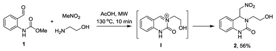 We initiated our synthesis of 3,4-dihydroquinazolinone 2 by a one-pot three step reaction between methyl (2-formylphenyl)carbamate (1), ethanolamine and nitromethane in acetic acid at 130 °C for 10 min under microwave irradiation. This afforded the desired alcohol product 2 in 56% yield along with 10% of an acetate side product due to the competing acylation reaction of alcohol 2 with acetic acid (Scheme 1). The ester side product may be subsequently transformed into the title product by simple basic hydrolysis. The reaction proceeds through the following three step cascade reaction sequence: (a) formation of an imine from ethanolamine and methyl (2-formylphenyl)carbamate; (b) concomitant intramolecular cyclization with carbamate to afford cyclic iminium ion I; and (c) finally, addition of nitromethane to iminium ion I gives the aza-Henry product 2 (Scheme 1). In summary, we report the direct synthesis and spectral characterization of a novel 3,4-dihydroquinazolinone.