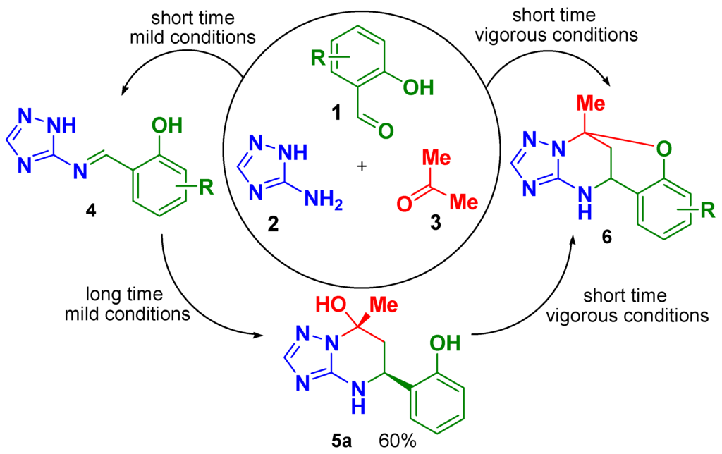 Application of multicomponent reactions (MCRs) in organic synthesis is a powerful method to create a chemical complexity from simple starting building blocks [1,2,3]. The use of aminoazoles in MCRs as building blocks having two or more nonequivalent reaction centers is often associated with ambiguous selectivity of the process and different reaction outcomes depending on the reaction conditions applied [4,5,6]. In particular, Biginelli-like MCRs of 3-amino-1,2,4-triazole with aldehydes and α-carbonyl CH-acids may result in several types of heterocyclic products (for a review see [7]). In our previous works we have shown that MCR of 3-amino-1,2,4-triazole (2) with acetone (3) and 2-hydroxybenzaldehydes (1) under acidic conditions leads to formation of different products, see Scheme 1. Under vigorous conditions, a series of oxygen-bridged compounds 6 was obtained with different substituents R, and only one example of open-bridge structure 5a (R = H) was isolated in high yield under mild conditions [5].