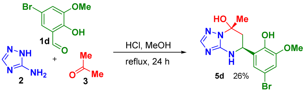 Synthesis of 5-(5-Bromo-2-hydroxy-3-methoxyphenyl)-7-methyl-4,5,6,7-tetrahydro[1,2,4]triazolo[1,5-a]pyrimidin-7-ol, (5R,7S)- and (5S,7R)- racemic mixture (5d), relative configuration of stereogenic centers is shown.