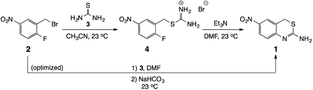 Many previous syntheses of 1,3-thiazin-2-amines have involved reactions of variously substituted enones with thiourea, and several cases proceeded in a tandem fashion [,,]. Several others have utilized metal catalysts to promote the heterocyclization []. Our synthesis began with 2-fluoro-5-nitrobenzyl bromide (2) [] and represents a potentially new approach to these compounds (see Scheme 1). With a reactive benzylic bromine and an activated fluorine situated ortho to each other on the aromatic ring, 2 is perfectly suited to react with two of the nucleophilic sites in thiourea (3) to generate the target heterocycle. It was hoped that this would lead to the title compound 1 by a tandem process, but in practice, the conversion was possible only by a sequential reaction. Nevertheless, it was possible to efficiently perform this transformation in a single reaction vessel in high yield.